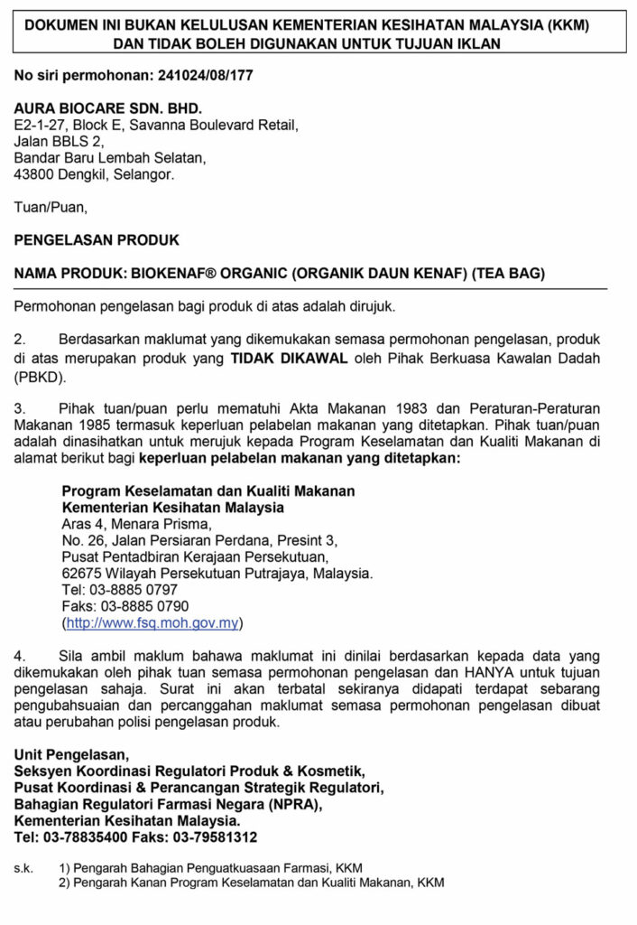 Biokenaf® telah dikelaskan oleh Kementerian Kesihatan Malaysia (KKM) sebagai makanan kesihatan befungsi tidak dikawal.